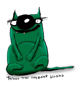 взглянем на этого кота... он только что поел, поел какую-то гадость видимо, тк кот зеленый О_о, что для котов в принципе не характерно.обратите внимание у этого представителя кошачьего племени очень кустистые брови, что явственно отсылает нас к Леониду Ильичу Брежневу. такой политизированный кошак получается. Кот этот не смотря на все выше сказанное является вампиром, что мы замечаем глядя на его огромные клыки.