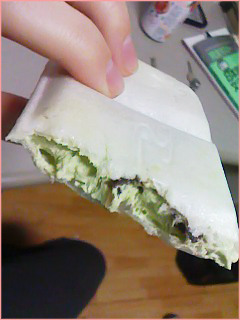 ← Вот такое вот делают мороженое со вкусом зеленого чая. Снаружи пенопластоподобная чуть сладкая оболочка,чтобы удобнее было есть; то, что кажется шоколадом - каштановая паста (каштан - плод этого сезона, его пихают во все, в блюда в кафешках, в разнообразные конфеты и тд). Пожалуй, мне все-таки нравится. Горьковато-сладковатое.