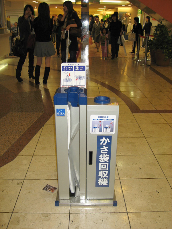 В связи с дождями пракически у каждого магазина выставляются специальный стойки: у магазинов попроще сам себе отрываешь целофановый пакет и засовываешь в него зонтик, у магазинов классом повыше - вот такие вот приборы →. Вставляешь зонт, а забираешь уже в пакете. Сухо и комфортно.