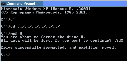 Важно записать загрузчик ПРАВИЛЬНО. В противном случае приставка его не увидит. Для этого мы сначала делаем в нашей карте «двойное дно», оставляя под ним небольшой пустой отсек. Для этого используем консольную программу mpf.exe. В качестве аргумента ей нужно указать букву съемного диска, присвоенную карте памяти.