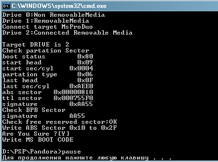 Карта памяти на 32Мб из комплекта поставки PSP для создания Пандоры не подходит, так как она хоть и MS Duo, но не Pro. C картой на 8Гб по последним данным проблем не возникает.