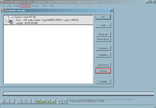 2) Вторым шагом я открыл получившийся фрагмент в VirtualDubMod, нажал на Streams – Stream list и сохранил звуковую дорожку, клинкув на Demux.