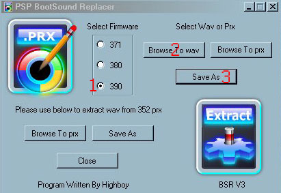 5) Уже можно запустить Boot Sound Replacer, поставить горошек на 390, указать программе на звук из п.4 с помощью кнопки Browse to wav и создать opening_plugin.prx с помощью кнопки Save As.