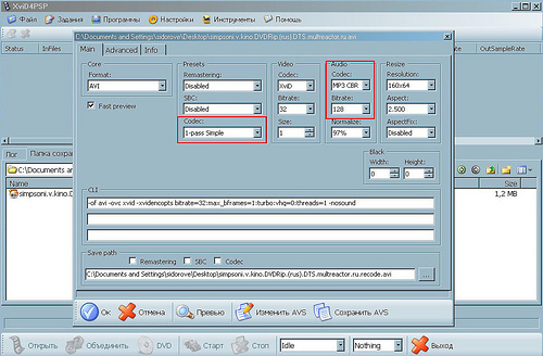 1) Для начала мульт пришлось прогнать через Xvid4PSP, чтобы оставить от полутора часов одну нужную минутку и перевести звук в MP3. Видео я выбрал AVI Xvid, 1-pass Simple с самым низким битрейтом, чтобы кодирование прошло максимально быстро.