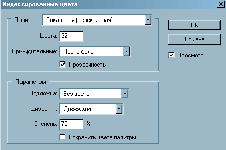 После того как текстура нарисована, выбирайте Изображение – Режим – Индексированные цвета и настройки как на скриншоте:
