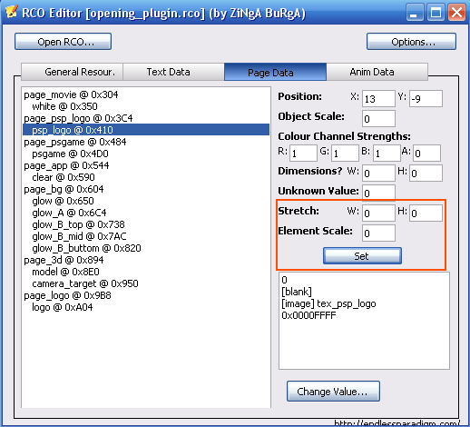 Page Data (третья). Здесь можно задать цвет, размер, позицию и масштаб для большинства элементов XMB. Нас интересует psp_logo, ведь именно ему соответствует картинка [GIM]tex_psp_logo.