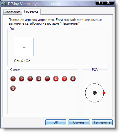 13) Но прежде чем полноценно им пользоваться, зайдите в панель управления - игровые устройства, выберите наш виртуальный джойстик и нажмите Калибровка на вкладке Настройка. Это поможет правильно настроить позиции аналогового джойстика PSP. Там же вы можете понажимать на все кнопки и наглядно увидеть результат: